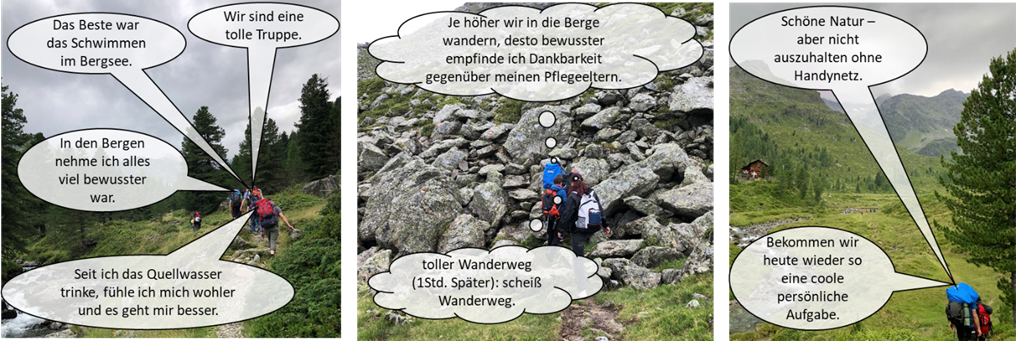 Die Natur, die Wetterphänomene, die Berge und Ausblicke der alpinen Welt beeindruckten die Jugendlichen tief. Die Anstrengungen der Wanderungen und anspruchsvollen alpinen Wegstrecken forderten alle. Aber unterschiedliche Erfahrungen prägten die jungen Menschen: Baden in einem kalten Bergsee, Trinken von Quellwasser, Schneefall im Sommer oder auch die „Nichterreichbarkeit“ wegen fehlendem Netz. Sie nahmen wahr, welche Kommunikation über ihr Handy für sie wesentlich ist und welche Alternativen sie für sich entwickeln können.